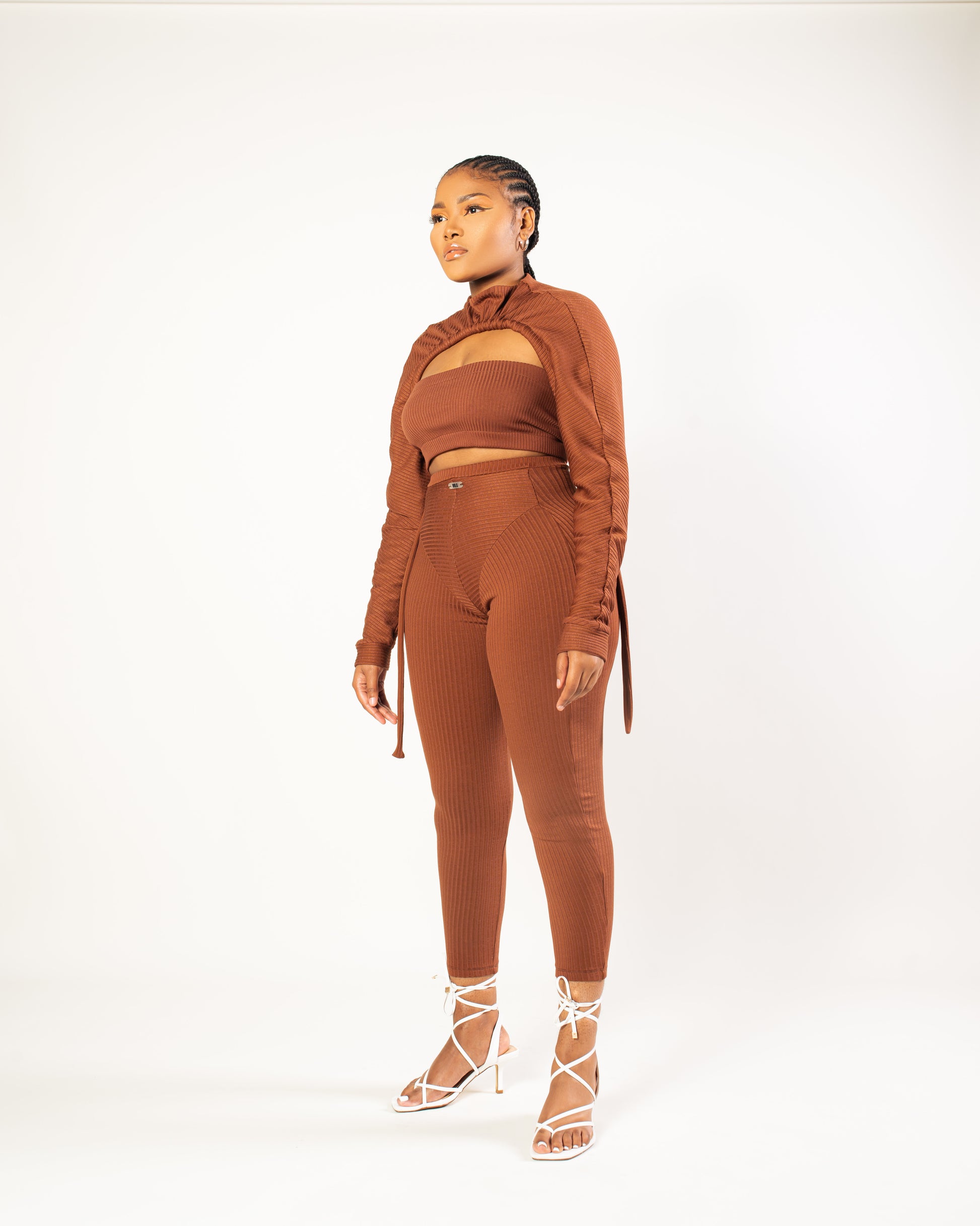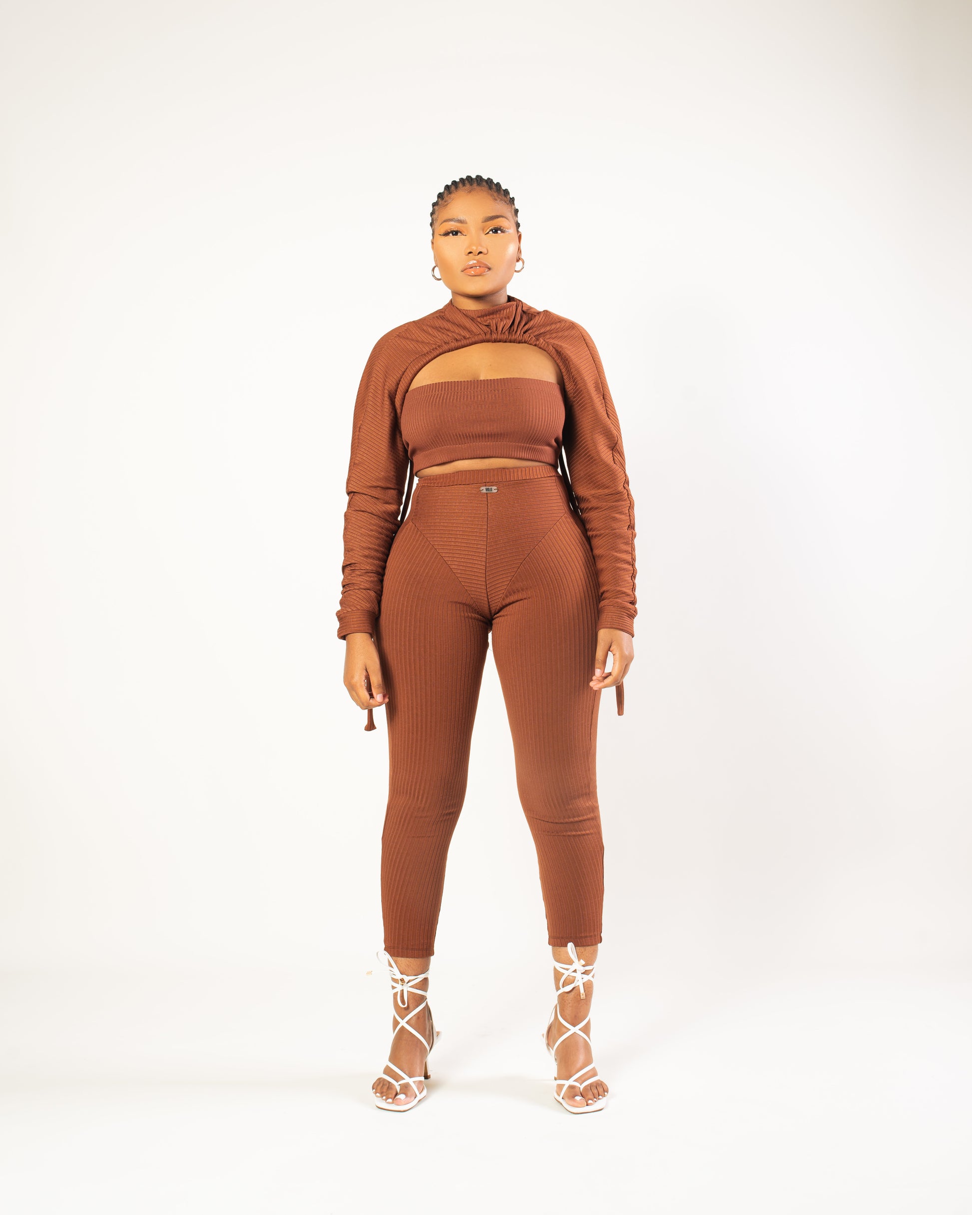 If you’re looking for a casual classy fit, look no further! This body tight and amazing cinnamon three-piece comes your way with a bandeau style front and a long sleeve drawstring top. Step in and pull on style with a cutout design at the front and center and a look that will suck you in, in all the right places! Dress up or casually...