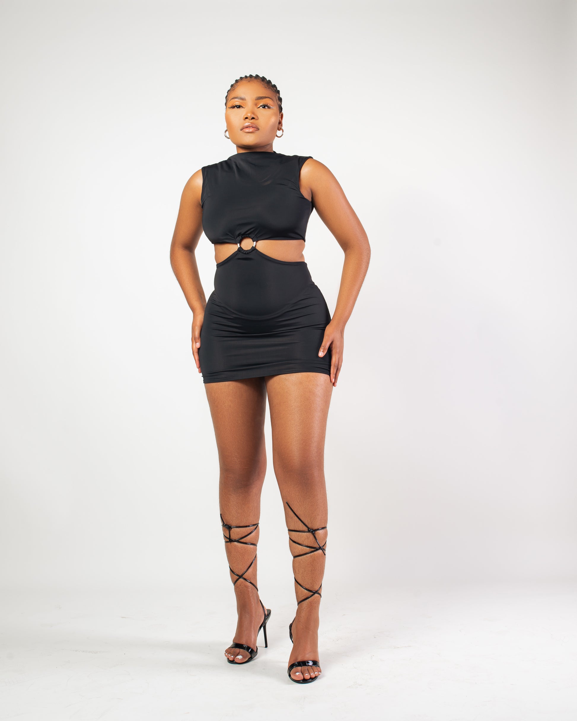 Let’s cut to the good stuff, shall we? This dress is fire and features soft slinky fabric with sweet stretch. High neckline with ring detailing. Hugs your body to accentuate your curves