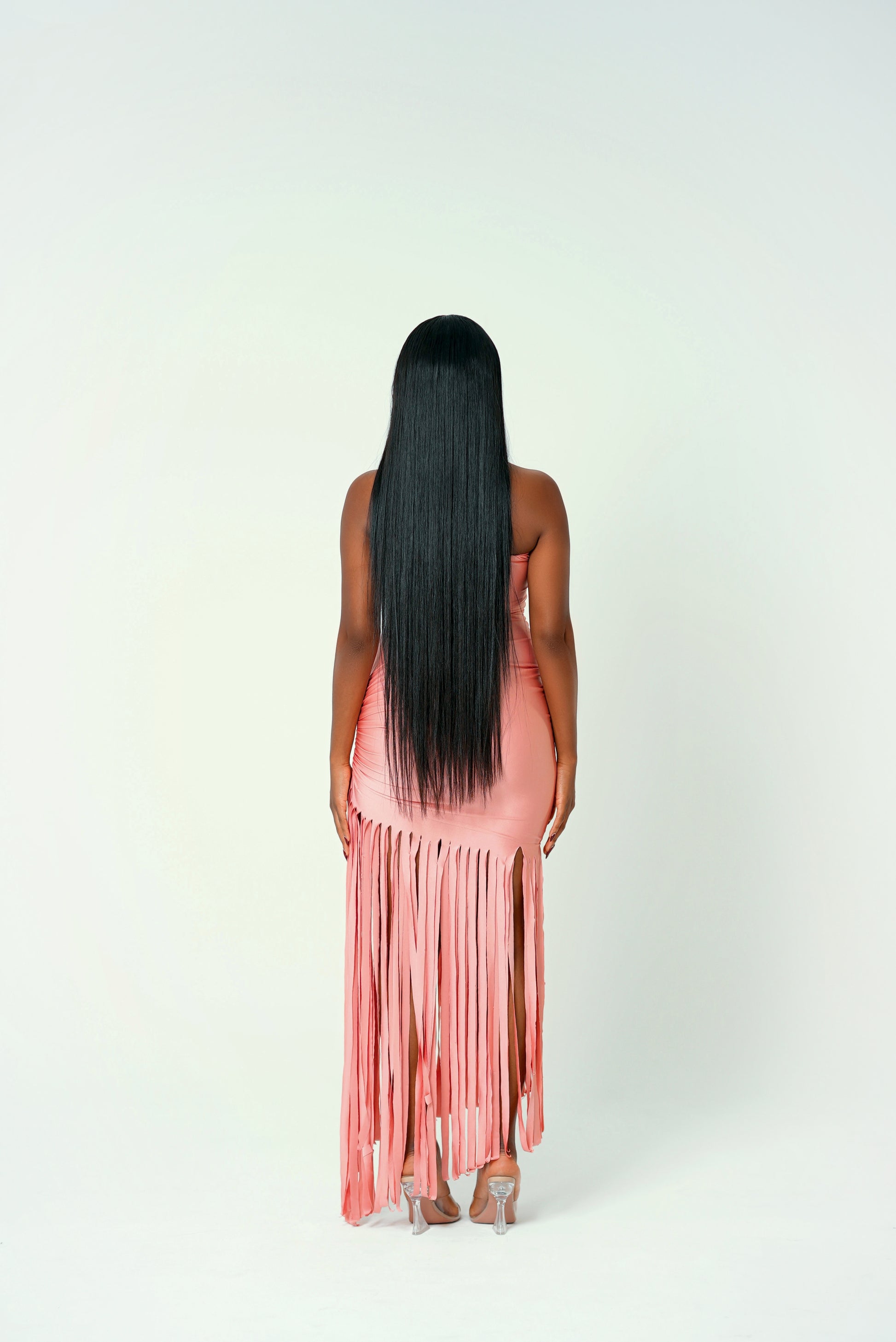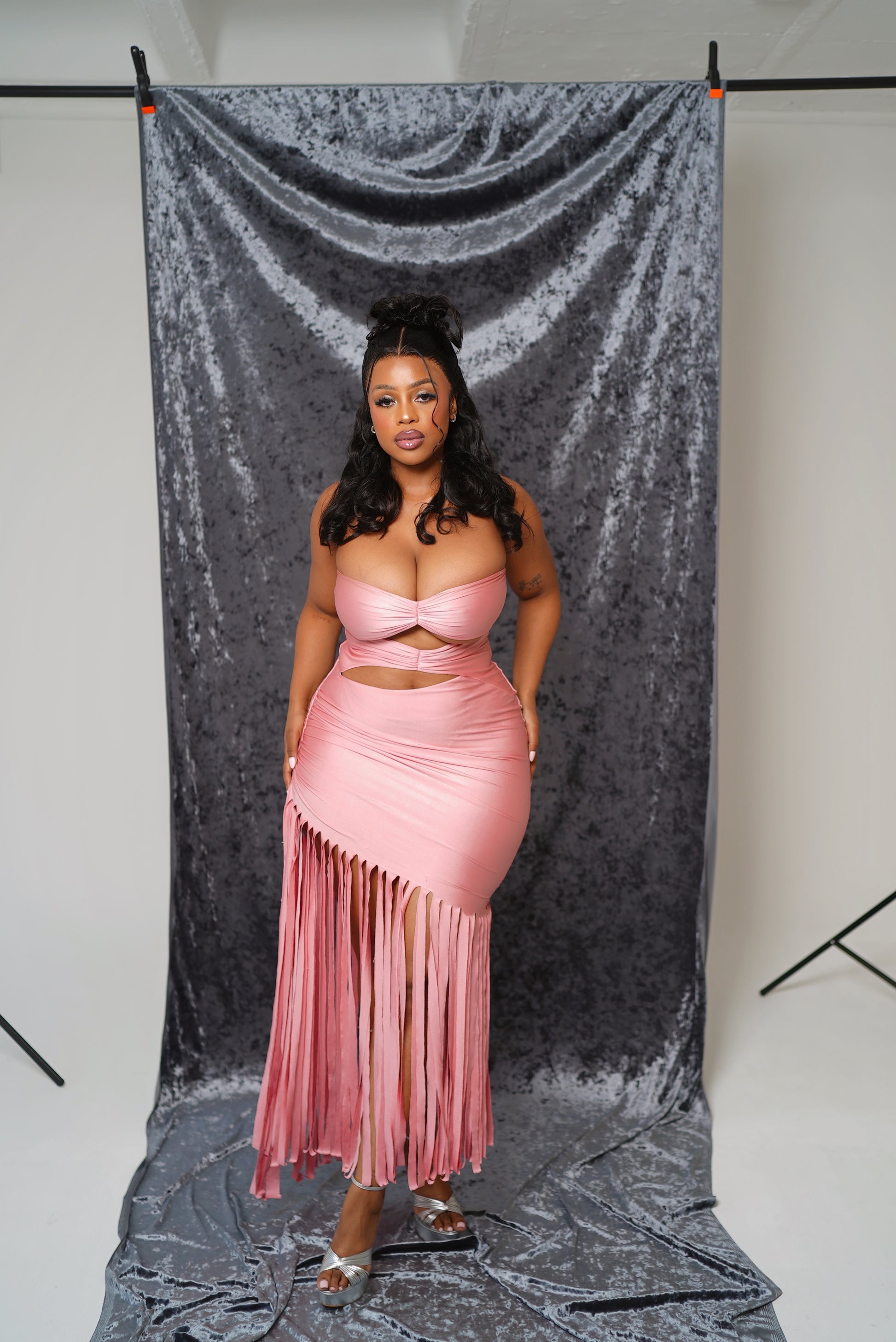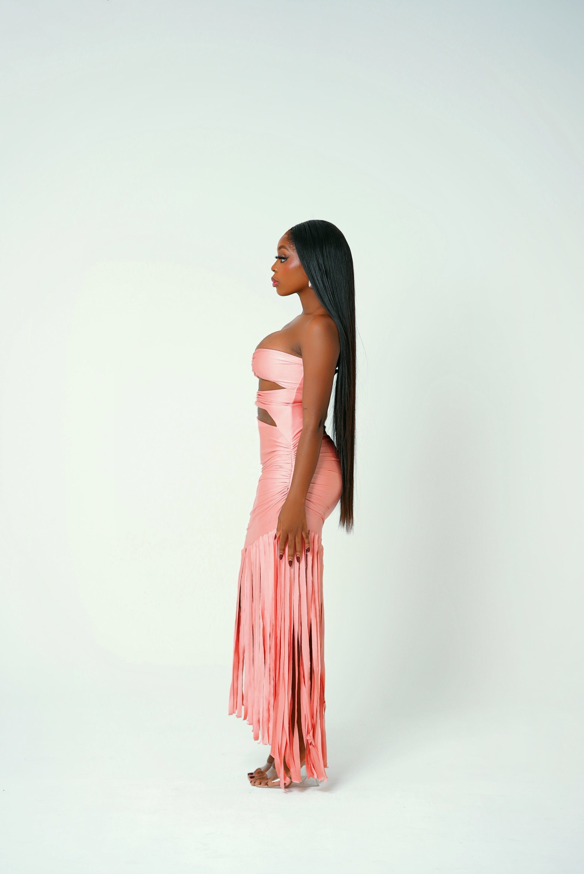 The Grace dress features daring cut-out detailing and asymmetrical fringe which adds movement and allure. The luxurious blush pink lycra fabric hugs the body to accentuate curves while the fringe trim at the hemline creates a playful twist on traditional elegance. This dress is a perfect choice for those seeking both style and sophistication.