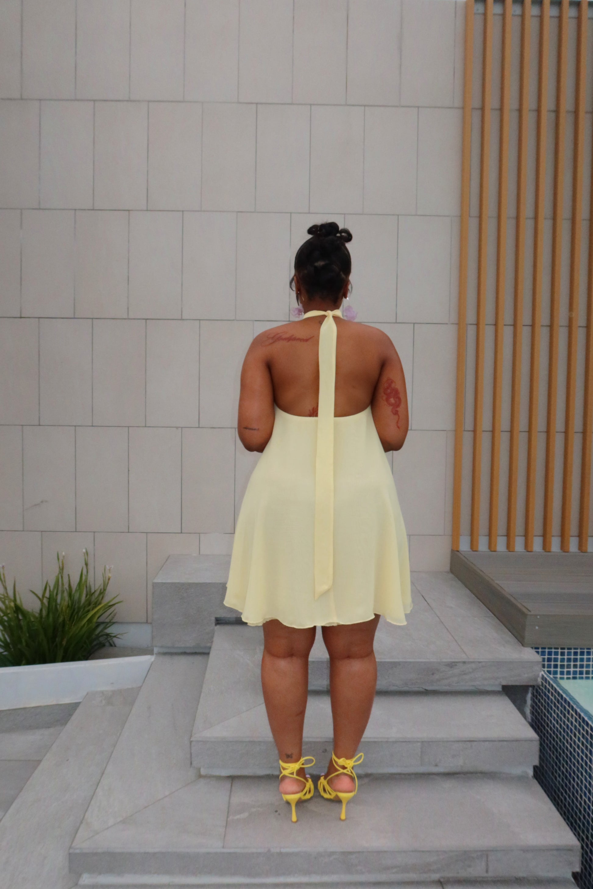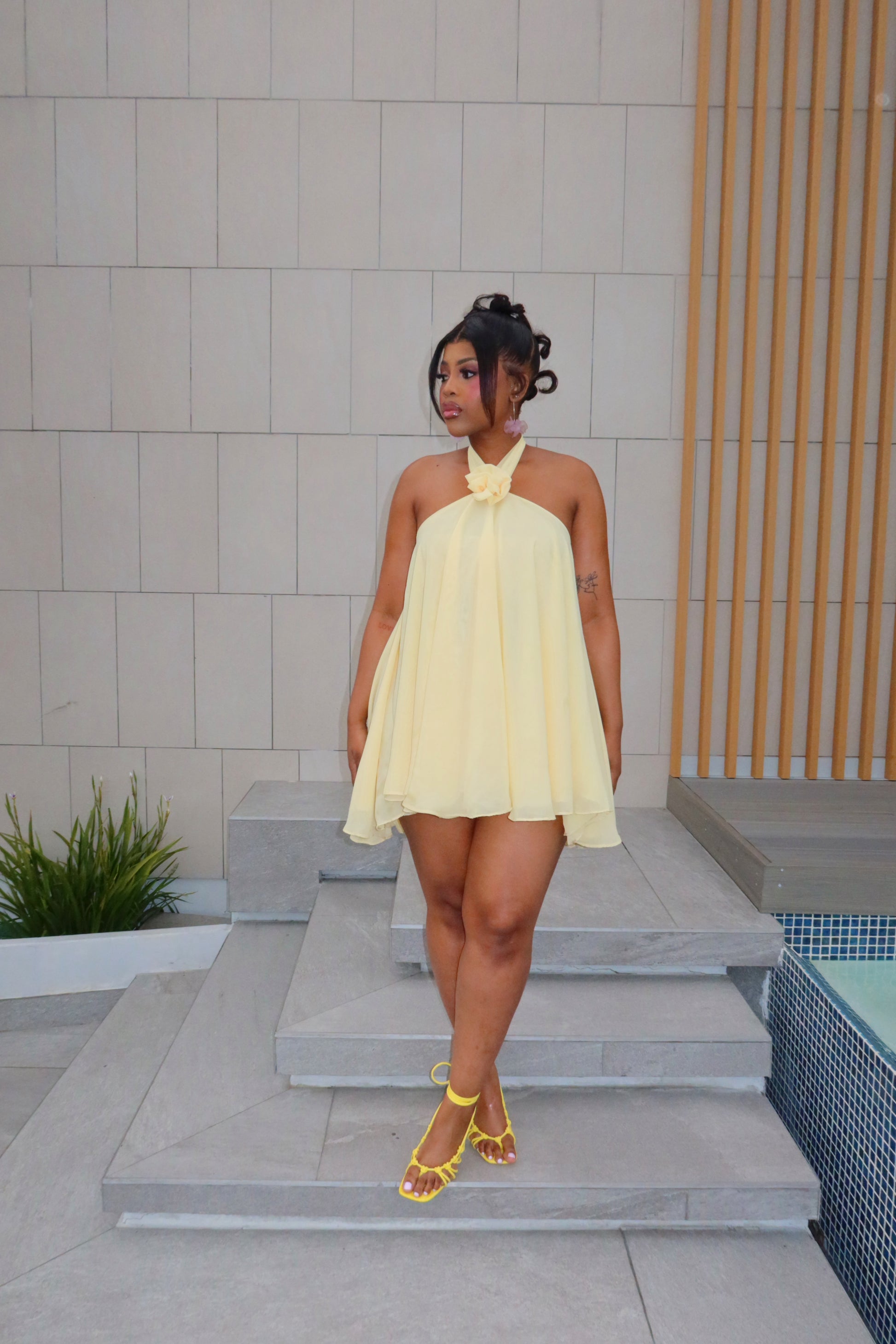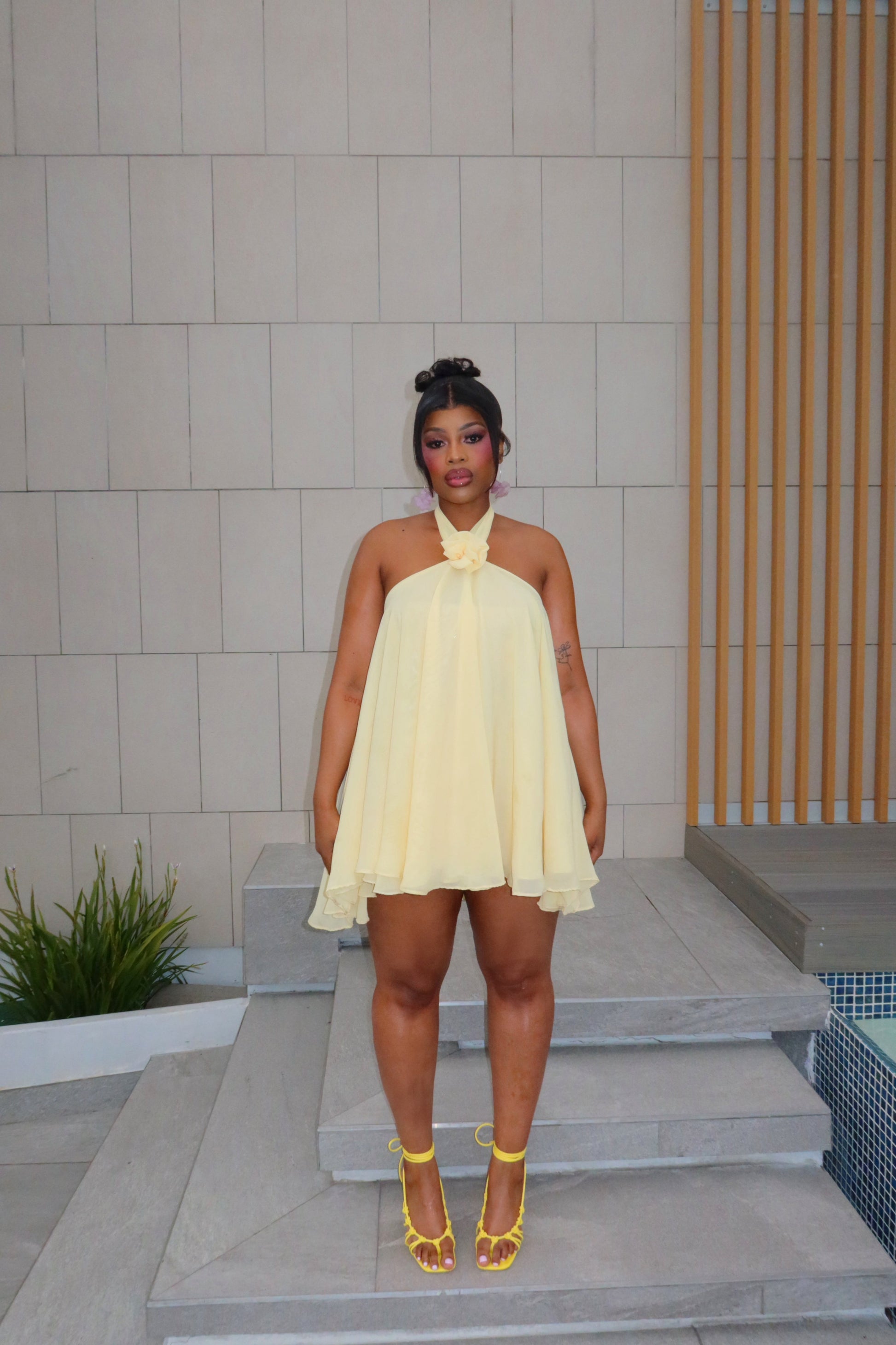 Glow like the desert sun in the Solara Dress. Crafted in a radiant butter-yellow hue, this halter mini is adorned with a delicate rosette detail at the neckline and a flowing silhouette that moves with ease. Playful yet sophisticated, Solara is perfect for golden hour cocktails, rooftop soirées or beach walks. Designed to flatter every curve while keeping you effortlessly comfortable, she’s your sunshine statement piece.